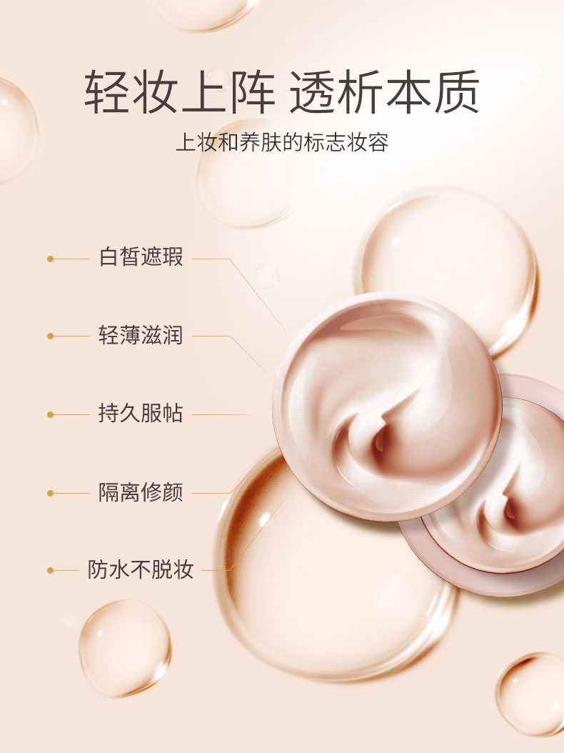 为东方女性肌肤而研发的无暇裸妆修颜霜, 本品具有遮瑕、隔离、防护、滋养、修颜等功效。如丝绸般的轻盈质地,与肌肤贴合更紧密,轻松遮盖瑕疵,隔离污染,不会受汗水、泪水、雾霾的影响,润色提亮,塑造如桃花般亲如闺蜜的粉嫩妆容,具完美的保养润色功效。